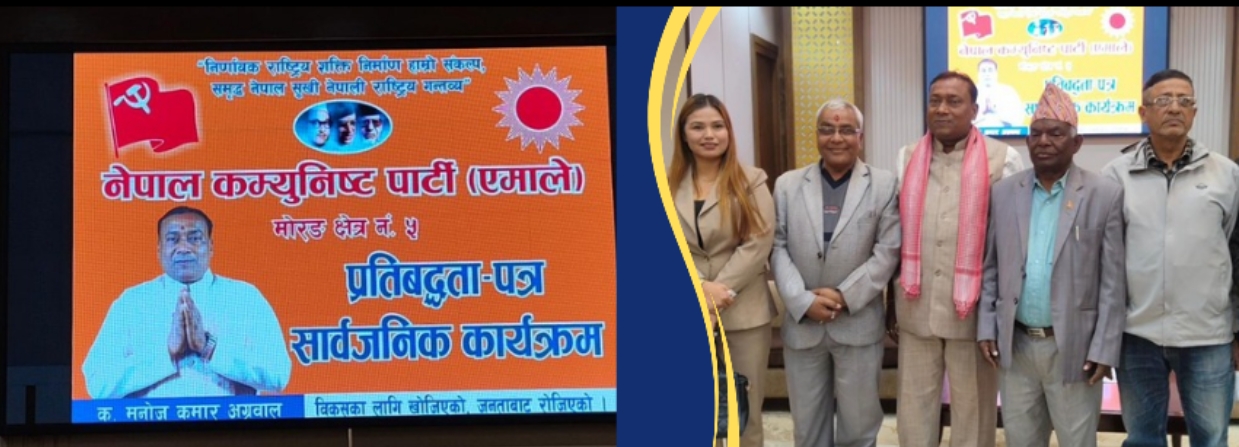 मोरंग क्षेत्र नं. ५ प्रतिनिधीसभा सदस्य निर्वाचनका उम्मेदवार नेपाल कप्युनिष्ट पार्टी (एमाले) का मनोज कुमार अग्रवालले कयापलट हुने गरी ९ बुद्धामा आफ्नो प्रतिवद्धतापत्र सार्वजनिक गरको छ । इमानदार, शान्त सोभाव, विकास प्रेमी, कर्मठ, युवा तथा जनपक्षीय उम्मेदवार अग्रवालले तर्फबाट फाल्ग..
