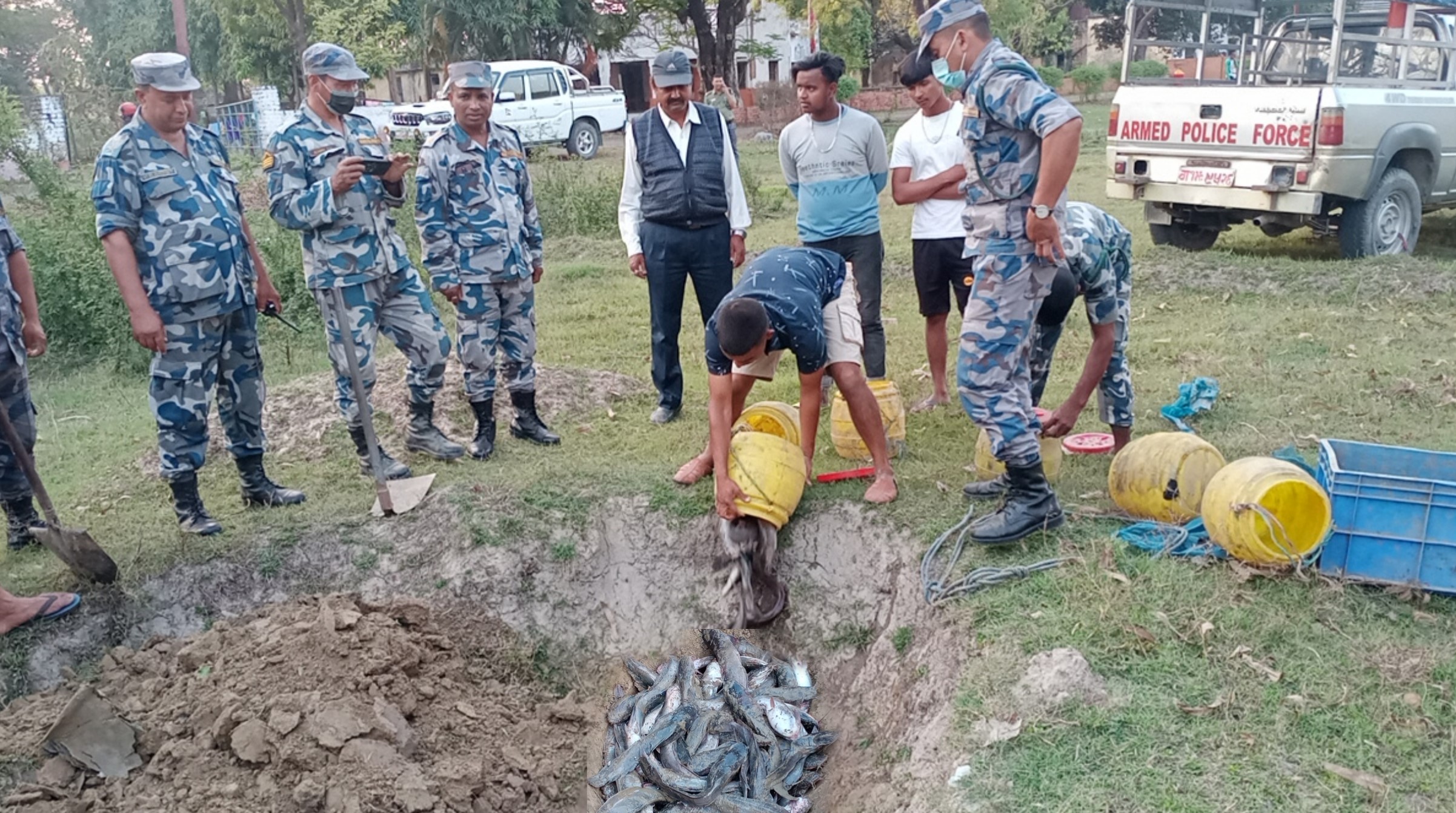 अवैध मुंग्री माछा नष्ट गर्दै पशु क्वारेन्टाइन र सशस्त्र प्रहरी
