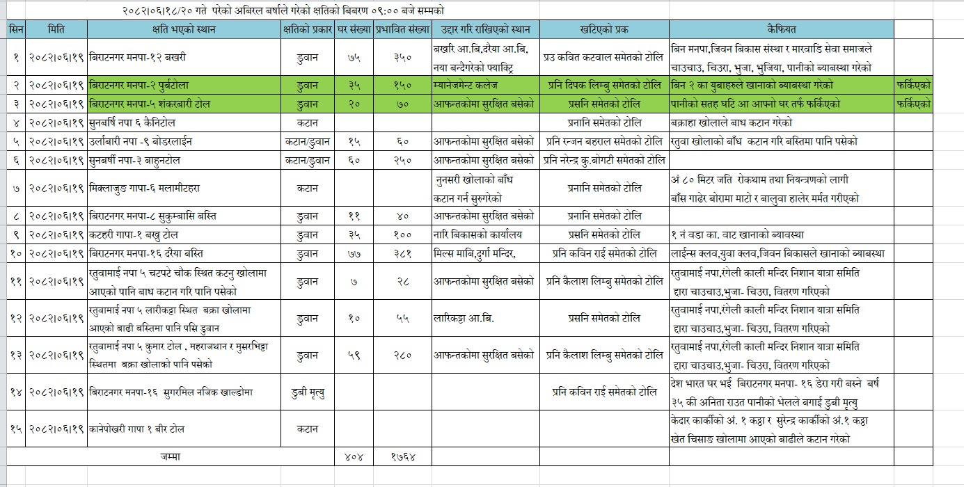 असोज १८ देखि २० गतेसम्म परेको अविरल वर्षाका कारण मोरङका विभिन्न स्थानहरू डुबानमा परेका छन्। जिल्लामा करिब ४०४ घर डुबानमा परी १,७६४ जना प्रभावित भएका छन् भने बाढीमा परी एक जनाको मृत्यु भएको छ।