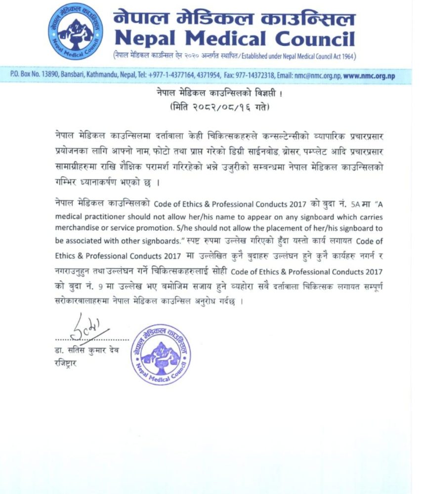 नेपाल मेडिकल काउन्सिलले चिकित्सकहरूलाई शैक्षिक परामर्शको प्रचारमा आफ्नै नाम र फोटो प्रयोग नगर्न निर्देशन