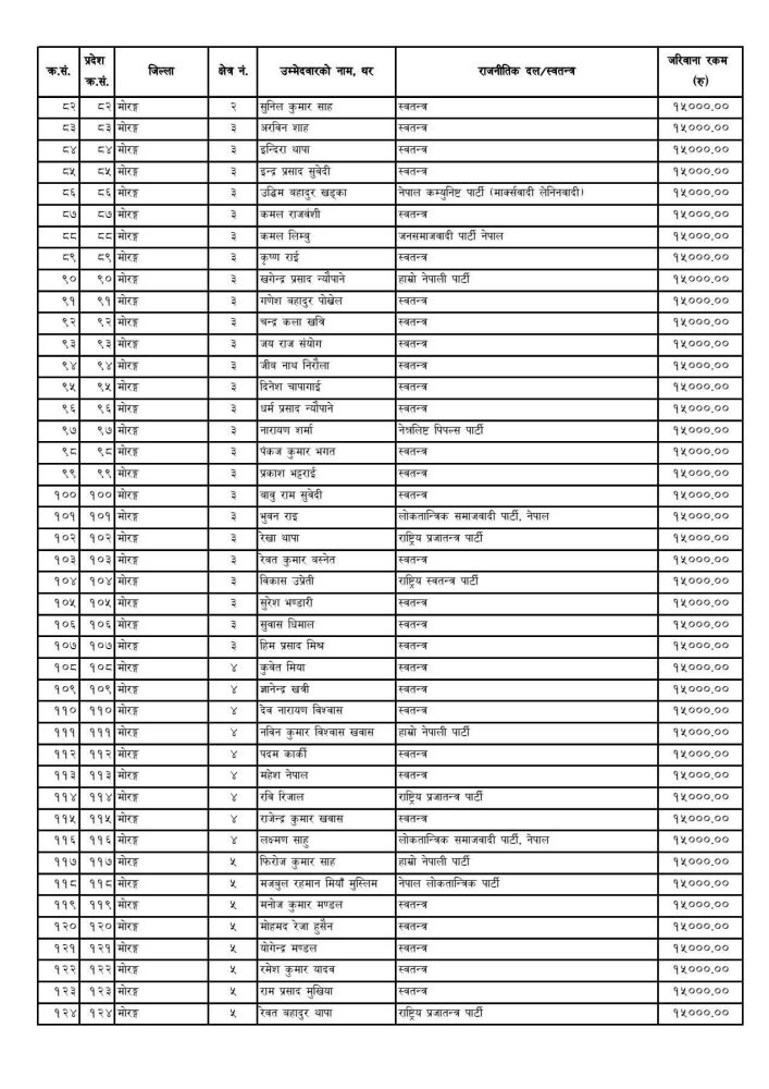 आयोगको मिति २०८० वैशाख ४ गतेको निर्णय अनुसार, यस समयभित्र निर्वाचन खर्च विवरण नबुझाउने उम्मेदवारहरुलाई निर्वाचन कसुर तथा सजाय ऐन २०७३ को दफा ३१ को उपदफा ४ बमोजिम रु १५,००० जरिवाना ठहराइएको छ।