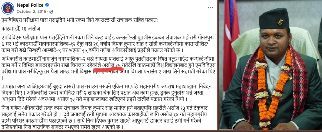 प्रहरीको विवरण अनुसार काठमाडौँ नागार्जुन नगरपालिका–२ बस्ने सायसा पन्तलाई आफू पुतलीसडकस्थित वर्ल्ड वाईड कन्सल्टेन्सीमा काम गर्ने र विभिन्न डाक्टरहरूसँग राम्रो चिनजान रहेको भन्दै गणेश अधिकारीले २०७३ साल असोज १५ गतेदेखि काठमाडौँ विश्वविद्यालयबाट हुने एमबिबिएस परीक्षामा पास गराइदिने भन्दै प्रलोभन दिएका थिए। त्यसका लागि उनले पन्तकी आमा विमला पन्तसँग दुई लाख रुपैयाँ लिने सहमति गरेका थिए।